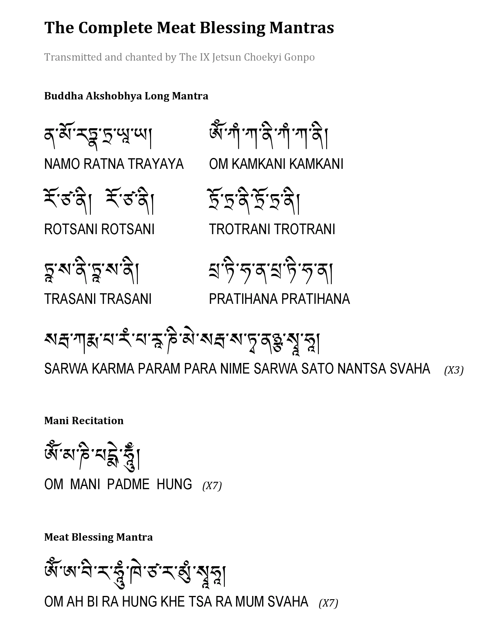 However, at the repetitive entreaties of his disciples, out of deep compassion for all, Rinpoche has kindly transmitted the below mantra to be chanted by those who are not observing vegetarian diets. This mantra can also be chanted by non-meat eaters who are joining meal with others that serve meat.